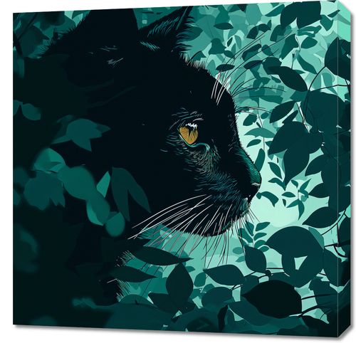 Obraz z serii wnętrza Oczekiwanie, przedstawia portret czarnego kota wtapiającego się w zielone liście. Artysta użył bogatej palety odcieni zieleni, aby stworzyć iluzję kota skrytego w gęstym listowiu, z wyraźnym, żółtym okiem, które przyciąga uwagę i daje wrażenie czujności i tajemniczości. Złożoność wzoru liści kontrastuje z prostotą cienia kota, co nadaje dziełu głębi i wielowymiarowości. Ten obraz byłby idealnym dodatkiem do każdego współczesnego wnętrza, które ceni subtelność i naturę, a także może być interesującym punktem centralnym w galerii sztuki lub przestrzeni wystawienniczej.