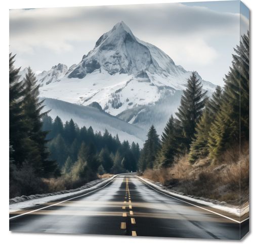 Obraz z serii pejzaże zatytułowany Odważna Podróż, przedstawia majestatyczną górę wyłaniającą się z pośród ciemnozielonych drzew iglastych, które wyznaczają drogę prowadzącą w kierunku jej śnieżnego szczytu. Siła i niezachwiana postawa góry w połączeniu z miękkimi konturami puchowych chmur nad nią tworzą doskonałą równowagę między wytrwałością a delikatnością. Czarna, wilgotna nawierzchnia drogi, rozświetlona światłem odbijającym się od jej wilgotnej powierzchni, prowadzi wzrok obserwatora wprost do serca dzikiej przyrody. Kontrast między ciemnymi drzewami a bielą śniegu dodaje dziełu głębi i tajemniczości. Ten obraz będzie idealnym dodatkiem do wnętrz o tematyce przygodowej i eksploracyjnej, jak również doskonałym wyborem dla przestrzeni biurowych firm turystycznych lub agencji podróżniczych, gdzie może inspirować i przypominać o majestacie i pięknie niezbadanych zakątków świata.
