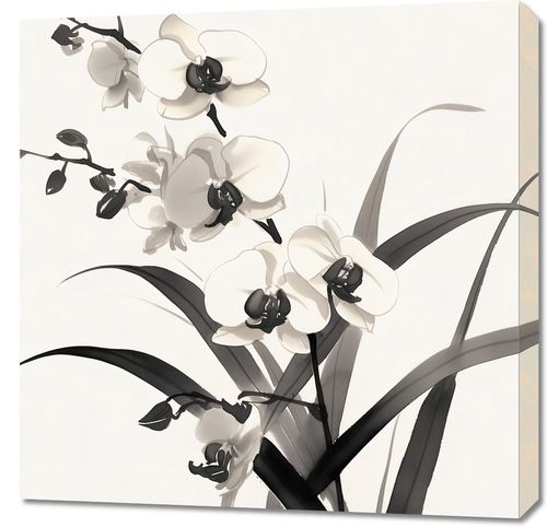 Obraz z serii wnętrza zatytułowany Orchidea. Na obraz widoczna jest stylizowana kompozycja kwiatów orchidei, przedstawiona w monochromatycznej kolorystyce. Dominują odcienie bieli i czerni, które tworzą silny kontrast, podkreślający delikatne kształty i szczegóły płatków oraz ciemniejsze środki kwiatów. Liście i łodygi są przedstawione w odcieniach szarości, co dodaje głębi i tekstury do obrazu. Całość kompozycji jest elegancka i nowoczesna, z subtelnymi gradientami i cieniowaniem dla realizmu. Tło jest jasne, co sprawia, że kwiaty wydają się jeszcze bardziej wyraziste. Ten obraz może być interpretowany jako połączenie naturalnego piękna z minimalistyczną estetyką, idealne do nowoczesnych wnętrz, które cenią sobie prostotę i elegancję.