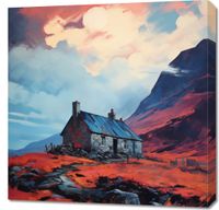 Obraz z serii pejzaże zatytułowany Ostatni Bastion. Obraz przedstawia osamotniony domek umiejscowiony w surowym, ale majestatycznym krajobrazie, pod dramatycznym niebem o intensywnych odcieniach czerwieni i błękitu. Zmierzch słońca rzuca ciepłe światło na dzikie, wrzosowe pola, tworząc kontrast z chłodnymi tonami górskiego tła. Ten obraz wyraża surowe piękno i niezłomność natury, a także ludzką tęsknotę za prostotą i ciszą. Idealnie nadaje się do wnętrz, które pragną wprowadzić poczucie spokoju, odosobnienia i kontemplacji natury.