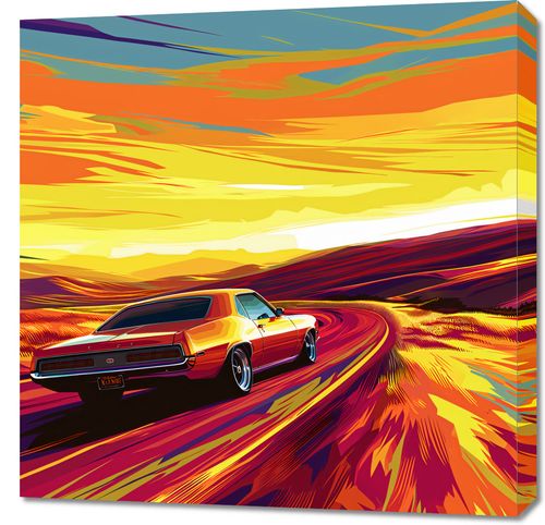 Obraz z serii abstrakcja zatytułowany Pędź Przed Siebie. Prezentuje klasyczny samochód w stylu muscle car, przemierzający pejzaż w kolorach zachodzącego słońca. Dynamiczne linie i żywe barwy od żółci, przez pomarańcz, aż po głębokie czerwienie tworzą wrażenie szybkości i wolności. Sylwetka samochodu, wyraźnie odznaczająca się na tle rozmytych kolorów, podkreśla moc i energię jazdy. Ten obraz idealnie wpasuje się w przestrzenie pełne dynamiki i pasji, takie jak garaże, salony gier, prywatne kina domowe lub nowoczesne salony. Doda on charakteru wnętrzu, inspirując do aktywności i cieszenia się każdą chwilą.