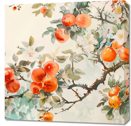 Obraz z serii abstrakcja zatytułowany Persymony. Przedstawia delikatną i kolorową ilustrację gałęzi owocowych w stylu azjatyckiej akwareli. Na obrazie widzimy rozkwitające kwiaty oraz dojrzałe, soczyste owoce persymony których intensywna pomarańczowa barwa jest pięknie wyeksponowana na tle pastelowych kolorów. Liście i gałęzie są przedstawione z subtelnymi niuansami zieleni i brązów, co dodaje głębi i naturalnego charakteru scenie. Ta sztuka łączy w sobie tradycyjne motywy i techniki malarskie z nowoczesnym podejściem do koloru i kompozycji, co czyni ją zarówno klasyczną, jak i współczesną. Obraz ten idealnie nadawałby się do przestrzeni, które cenią spokój i harmonię, takich jak salony relaksacyjne, gabinety spa, czy jako wyrafinowany akcent w domowej jadalni.