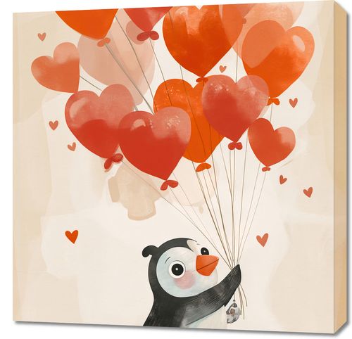 Obraz z serii wnętrza zatytułowany Pingwinek z Balonami przedstawia uroczego pingwina trzymającego sznurki czerwonych balonów w kształcie serc, które unoszą się tworząc radosną atmosferę. Subtelne serduszka zdobią również tło, nadając ilustracji miłościwej i ciepłej aurze. Kolorystyka obrazu, z dominującymi ciepłymi odcieniami czerwieni i pomarańczy na kremowym tle, wywołuje uczucie radości i miłości. To dzieło sztuki idealnie sprawdzi się jako dekoracja w przestrzeniach, które mają na celu inspirować pozytywnymi emocjami, takich jak pokoje dziecięce, przedszkola, czy też jako prezent na Walentynki czy inną romantyczną okazję.