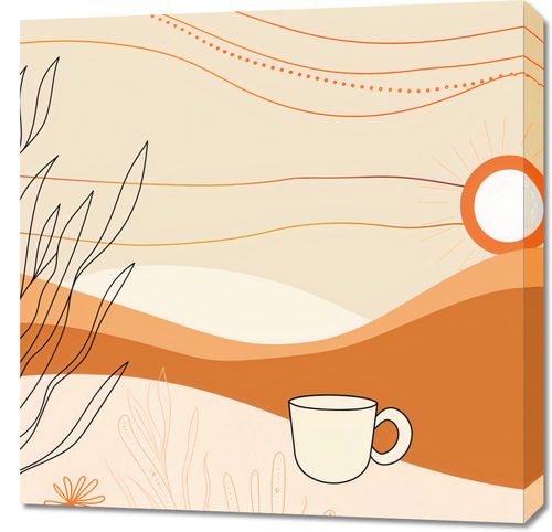 Obraz z serii minimalistyczne zatytułowany Ranna Pora. Obraz przedstawia stylizowany, spokojny krajobraz pustynny z wschodzącym słońcem, które emanuje ciepłem, barwiąc niebo w pastelowe odcienie. Ponad łagodnymi, falującymi wzgórzami widnieją delikatne linie, które mogą przypominać ciepłe prądy powietrza lub subtelne ozdoby. Na pierwszym planie znajduje się filiżanka kawy, umieszczona tak, jakby była częścią pustynnego terenu, co dodaje scenie element codziennego rytuału i spokoju. Obraz jest pełen ciepłych, ziemiście beżowych i pomarańczowych odcieni, które wprowadzają atmosferę relaksu i spokoju. Idealnie pasuje do przestrzeni wypoczynkowych, takich jak kawiarnie, salony, czy pokoje do odpoczynku, gdzie może pomóc stworzyć przytulne i spokojne otoczenie. Dzieło to z pewnością będzie przyciągać wzrok, będąc subtelny jednocześnie.