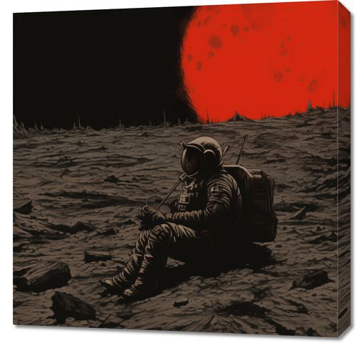 Obraz z serii abstrakcja zatytułowany Samotność w Kosmosie przedstawia astronautę siedzącego na pustkowiu księżycowym, z ogromną czerwoną gwiazdą w tle. Osamotniony kosmonauta wygląda na zamyślonego lub odpoczywającego, otoczony przez surowy, nierówny krajobraz księżycowy, z jego charakterystycznymi kraterami i szczytami. Obraz emanuje głębokim spokojem i izolacją, podkreślając zarówno piękno, jak i nieprzewidywalność przestrzeni kosmicznej. Wyrazisty kontrast między ciemnymi skałami a jaskrawą gwiazdą podkreśla dramatyczną aurę tej sceny. Ten obraz idealnie nadawałby się do dekoracji ścian w domowych biurach lub przestrzeniach edukacyjnych, inspirowanych tematyką kosmiczną.