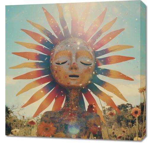 Obraz z serii pop art zatytułowany Słoneczna Medytacja. Ta inspirująca grafika przedstawia statuę medytującej postaci z aureolą w kształcie słońca, symbolizującą spokój wewnętrzny i oświecenie. Postać, zanurzona w polu kwiatów, z zamkniętymi oczami i twarzą skierowaną ku słońcu, promieniuje spokojem i harmonią. Naturalne barwy ziemi oraz promienie słońca nadają kompozycji ciepła i głębi, tworząc uczucie jedności z naturą. Ten obraz będzie doskonałym dodatkiem do przestrzeni, które cenią sobie spokój i kontemplację, takich jak salony jogi, przestrzenie do medytacji lub jako relaksujący akcent w domowych wnętrzach.