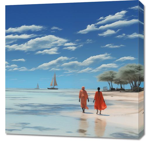 Obraz z serii pejzaże zatytułowany Spokój w Piaskach przedstawia dwie postacie w tradycyjnych pomarańczowych szatach, kroczących boso po dziewiczym piasku plaży. Ich spokojny postęp odzwierciedla harmonię i spokój, a delikatne fale i żaglowce w tle dodają uczucia swobody. Płynące chmury na niebie nadają scenie wrażenie przestrzeni i czasu, który wydaje się zatrzymany. Ten obraz emanuje duchowym spokojem i jest idealny do pomieszczeń przeznaczonych do medytacji, wypoczynku lub terapii, a także jako spokojny akcent w przestrzeniach hotelowych czy biurowych, gdzie zachęca do refleksji i wewnętrznej harmonii.