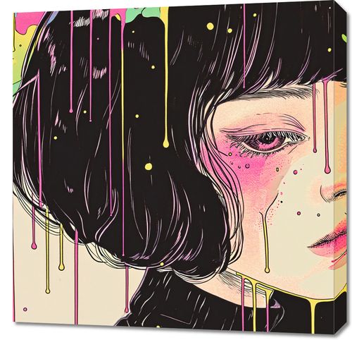 Obraz z serii pop art zatytułowany Strugi Kolorów. Ten hipnotyzujący obraz przedstawia wizerunek młodej kobiety z przymkniętymi oczami, jej twarz zdaje się być na granicy snu i jawy. Nad nią i wokół niej płyną strugi kolorów, które wydają się rozlewać jak ciecz, tworząc atmosferę oniryczną i abstrakcyjną. Kontrast między realistyczną twarzą a surrealistycznym tłem podkreśla emocjonalną głębię i złożoność ludzkich doświadczeń.Obraz ten doskonale uzupełni przestrzeń pełną kreatywności i wyobraźni, taką jak pracownie artystyczne, kawiarnie, czy nawet nowoczesne pokoje młodzieżowe. Może również stanowić niebanalny akcent w pomieszczeniach terapeutycznych lub coachingowych, gdzie rozmowa na temat emocji i wewnętrznego świata jest na porządku dziennym.
