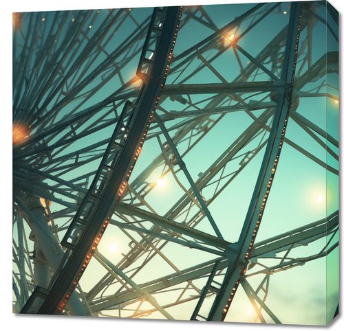 Obraz z serii wnętrza zatytułowany Światła Molocha. Na tym zachwycającym zdjęciu wielka konstrukcja diabelskiego młyna jest uchwycona z nietypowej perspektywy, ukazując skomplikowaną sieć metalowych prętów oświetlonych setkami migoczących światełek. Złoty zachód słońca w tle nadaje scenie ciepły, oniryczny nastrój. Ten obraz to pochwała inżynierskiego geniuszu i miejskiego życia, idealnie komponujący się w nowoczesnych przestrzeniach, takich jak biura, lofty, a także w przestrzeniach publicznych czy domowych salonach. Jest to również doskonała inspiracja dla tych, którzy cenią sobie miejską estetykę i nowoczesny design.
