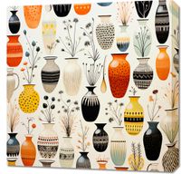 Obraz z serii wnętrza zatytułowany Symfonia Wazonów. Wspaniałe wazony w bogatej palecie kolorów, od głębokiej czerni do ciepłych odcieni pomarańczu, tworzą intrygującą mozaikę wzorów i kształtów. Delikatne motywy roślinne, które zdobią niektóre wazony, dodają uroku i lekkości, a różnorodność wzorów i faktur przyciąga wzrok i zaprasza do głębszej refleksji. Kontrast między jasnymi i ciemnymi barwami, a także subtelne niuanse w każdym wazonie, dodają tej kompozycji głębi i dramatu. Ten artystyczny plakat doskonale wpisuje się w klimat wyrafinowanych galerii sztuki, eleganckich kawiarni oraz nowoczesnych przestrzeni mieszkalnych, które stawiają na unikatowy design.