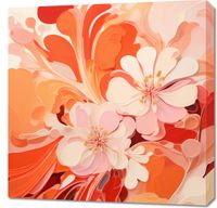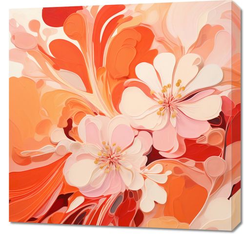 Obraz z serii wnętrza zatytułowany Taniec Kwiatów. Fascynujące płatki w odcieniach koralu i różu układają się w dynamiczną kompozycję, niczym tancerki w wirującej sukni. Delikatne smugi i krople w tonacjach pastelowych dodają obrazowi głębi i lekkości, tworząc wrażenie ruchu i życia. Centra kwiatów, z delikatnie wyrysowanymi pręcikami, przyciągają uwagę, wprowadzając nutę delikatności i subtelności. Świetnie sprawdzi się w nowoczesnych salonach spa, gabinetach kosmetycznych oraz w sypialniach o romantycznym charakterze.