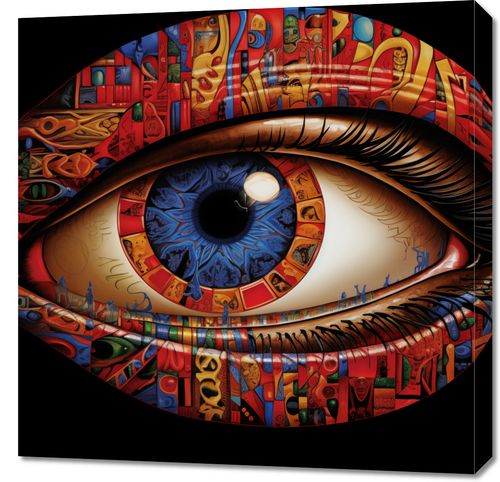 Obraz z serii abstrakcja zatytułowany W Oku Obserwatora. Ta złożona, surrealistyczna grafika przedstawia ludzkie oko, w którego tęczówce odzwierciedlone są bogate, abstrakcyjne i symboliczne wzory, przypominające fragmenty różnych dzieł sztuki. Barwne motywy w tęczówce mieszają się z intensywną czerwienią, żółcią i niebieskością, tworząc efekt kalejdoskopu kulturowych wpływów. Zadziwiająca szczegółowość pracy sugeruje głębię ludzkiego spojrzenia i różnorodność perspektyw, które możemy doświadczać poprzez sztukę. Obraz ten z pewnością zaintryguje i stanie się punktem centralnym każdej przestrzeni, szczególnie tam, gdzie sztuka i kreatywność są w cenie, jak studia artystyczne, galerie, czy nowoczesne salony.