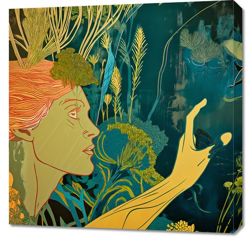 Obraz z serii abstrakcja zatytułowany Wezwanie do Flory, ukazuje poetycką synergię między ludzką postacią a naturą. Zanurzona w bogatym, zielonym otoczeniu, kobieta wydaje się być jednością z leśną fauną i florą, które są stylizowane w surrealistyczny sposób. Jej czerwone włosy przechodzą w płatki kwiatów, a kontury jej twarzy delikatnie współgrają z organicznymi kształtami roślin. Obraz ten, z jego żywymi kolorami i złożoną kompozycją, idealnie nadaje się do przestrzeni, która celebruje naturę i sztukę, takich jak galerie, nowoczesne mieszkania, lub przestrzenie publiczne o tematyce ekologicznej. Ta praca przyciąga wzrok i inspiruje do refleksji nad bliskimi związkami człowieka z przyrodą.