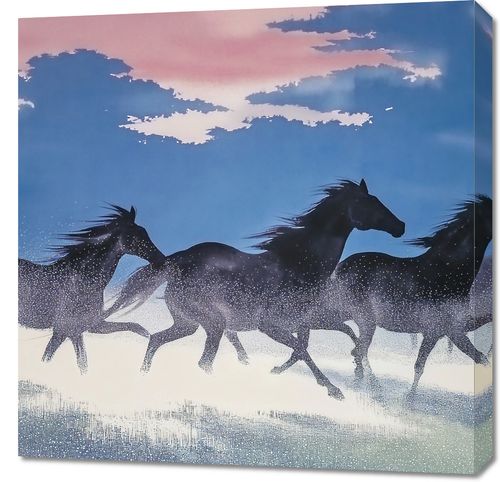Obraz z serii abstrakcja zatytułowany Wolność i Swoboda.Przedstawione na obrazie sylwetki koni są zarysowane na tle zachodzącego słońca, które barwi niebo w odcienie różu i błękitu, tworząc kontrast z ich ciemnymi postaciami. Drobne kropki tworzą iluzję kurzu unoszącego się pod ich kopytami, co dodaje scenie żywotności i ruchu. Ten obraz jest hołdem dla surowej siły i gracji koni oraz dla wolności, którą one symbolizują. Doskonale sprawdzi się jako wyrazisty element dekoracyjny w pomieszczeniach o różnorodnym wystroju, od nowoczesnych biur po rustykalne przestrzenie mieszkalne, dodając im charakteru i inspiracji.