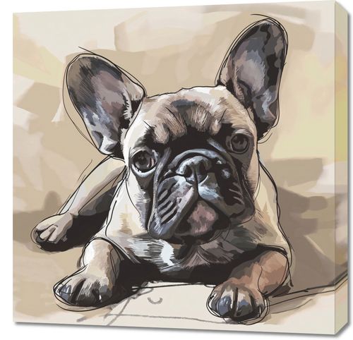 Obraz z serii wnętrza zatytułowany Zawsze Czeka, przedstawia realistycznie oddanego buldoga francuskiego w odcieniach beżu i brązu, z charakterystycznymi dużymi uszami i głębokim spojrzeniem. Pies leży na ciepło oświetlonym podłożu, a jego cień rozmywa się w tle. Użyta paleta kolorów nadaje obrazowi przytulny i domowy nastrój, podczas gdy szczegółowe tekstury sierści dodają głębi i realizmu. Ten obraz idealnie wpasuje się w wnętrza domowe, wnosząc element ciepła i towarzyskości. Może być doskonałym akcentem w salonie, gdzie domownicy i goście często gromadzą się na wspólne chwile, lub w przestrzeniach dedykowanych miłośnikom zwierząt.