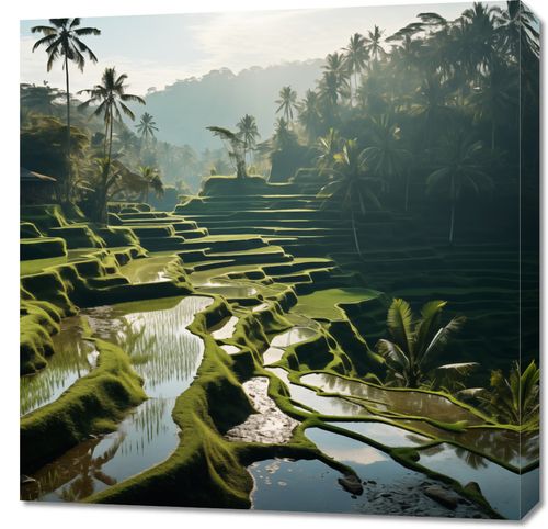 Obraz z serii pejzaże zatytułowany Zielone Sanktuarium. Sceneria prezentuje idylliczne tarasy ryżowe otoczone przez soczyste zieleń drzew palmowych i subtelną mgłę poranną. Delikatne światło słońca przebija się przez listowie, rzucając tajemnicze cienie i podkreślając wielowymiarowość krajobrazu. Harmonia kolorów i światła zachęca do refleksji i wyciszenia. Idealnie uzupełni przestrzeń domową, stając się oazą spokoju, jak również znajdzie swoje miejsce w przestrzeniach biznesowych, takich jak spa czy gabinety relaksacyjne, gdzie natura jest częścią terapii.