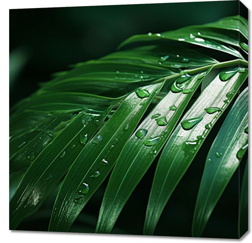 Obraz z serii natura zatytułowany Żywa Łagodność, przedstawia szczegółowe zbliżenie na liście palmy w odcieniach żywej zieleni, oświetlone promieniami słońca przenikającymi przez ich szpary. Gładkie i lśniące liście, z delikatnymi kroplami wody na ich powierzchni, tworzą poczucie ruchu i dynamiki, podczas gdy ich kontrastujące linie i formy wnoszą element struktury i elegancji. Delikatne światło i cienie na liściach, w połączeniu z bogatą paletą zieleni, wywołują uczucie spokoju oraz bliskości z naturą. Ta fotograficzna kompozycja mogłaby doskonale uzupełnić wnętrza, które cenią naturalność i organiczną estetykę, takie jak eko-salon, przestrzeń do jogi lub biura koncentrujące się na zrównoważonym rozwoju i ekologicznych inicjatywach.
