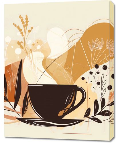 Obraz z serii minimalistyczne zatytułowany Aromatyczna Przerwa. Grafika ta przedstawia sylwetkę ciemnego kubka kawy, który jest otoczony przez abstrakcyjne kwiatowe motywy i organiczne kształty w ciepłych odcieniach karmelu, brązu i beżu, przypominających bogactwo i głębię smaków kawy. Przezroczyste i subtelne linie dodają lekkości i wyrafinowania całej kompozycji.Ten obraz świetnie odnajdzie się w wnętrzach, gdzie chwile relaksu i odpoczynku są cenione. Doskonale nadaje się do przytulnej kawiarni, jadalni, czy nawet domowej kuchni, gdzie może przypominać o przyjemności płynącej z przerwy na kawę.