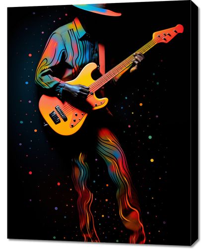 Obraz z serii pop art zatytułowany Barwna Melodia. Ta energetyzująca ilustracja przedstawia sylwetkę gitarzysty w intensywnych, neonowych barwach, które pulsują rytmicznie wokół jego postaci, tworząc wizualny odpowiednik muzycznych dźwięków. Postać muzyka, pozbawiona wyraźnych detali, pozwala skupić się na ekspresji i emocji przekazywanej przez muzykę. Obraz ten jest idealny dla miłośników muzyki, sztuki współczesnej i dynamicznych, kreatywnych przestrzeni, doskonale nadaje się do studiów nagrań, pokojów muzycznych, klubów, a także jako wyrazisty element dekoracyjny w nowoczesnych domach.
