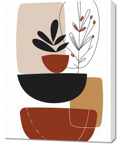 Obraz z serii minimalistyczne zatytułowany Botaniczna Abstrakcja. To artystyczne dzieło przedstawia stylizowane, botaniczne motywy ukryte wśród geometrycznych form. Delikatne rośliny w doniczkach uchwycone są w prostych, ale wyrafinowanych konturach, zaznaczających ich sylwetki na tle złożonego z ciepłych i neutralnych barw tła. Brązy i beże splatają się tu z głęboką czerwienią, tworząc organiczne poczucie natury uproszczonej do esencji formy. Ten obraz doskonale odnajdzie się w przestronnych, jasnych wnętrzach, gdzie natura spotyka się z minimalizmem - idealny do salonów w stylu skandynawskim, spokojnych gabinetów, lub jako ukojenie w dynamicznym, miejskim biurze.