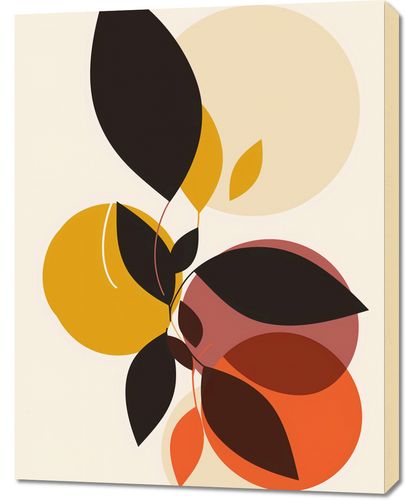 Obraz z serii minimalistyczne zatytułowany Brzask Złota.Ta grafika cechuje się prostotą form i bogactwem barw. Kontrastujące kształty liści na tle stonowanych kół tworzą harmonijną całość, która może być interpretowana jako metafora równowagi w przyrodzie. Ciepłe kolory żółci i pomarańczy przenikają się z głębokimi odcieniami brązu, co może sugerować zmianę sezonów lub cykl życia. Stylizacja ta przypomina o spokojnym, lecz żywym rytmie natury i mogłaby doskonale wpasować się w przestrzeń domową jako element dekoracyjny, niosący ze sobą spokój i refleksyjność.