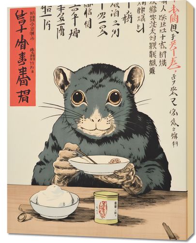 Obraz z serii motywy wschodnie zatytułowany Chwila Refleksji. Intrygujące spojrzenie gryzonia w tradycyjnym stroju, podkreślane przez błękitną tunikę i precyzyjne detale, które nadają mu humanoidalnego charakteru. Czerwone naczynia oraz kanji w tle kontrastują z jasnymi barwami obrazu, dodając nuty głębi i dziedzictwa kulturowego. Subtelna gra światła i cienia na stoliku z jedzeniem i napojem wzbogaca kompozycję i zachęca do refleksji nad połączeniem tradycji z nowoczesnością. Świetnie sprawdzi się w kawiarniach o azjatyckim klimacie, galeriach sztuki oraz w przestrzeniach dedykowanych kulturze Wschodu.
