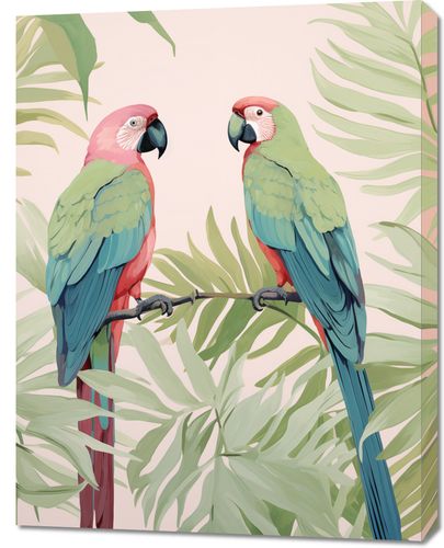 Obraz z serii wnętrza zatytułowany Dialog Ara. Na tej jasnej i pełnej życia ilustracji widzimy dwie papugi ary, które z gracją spoczywają na gałęzi, otoczone tropikalnymi liśćmi palm. Ich wyraziste, kolorowe upierzenie w odcieniach różu, zielonego i błękitu przyciąga wzrok i wprowadza egzotyczną atmosferę do każdej przestrzeni. Obraz ten jest idealnym wyborem dla miłośników natury i kolorowych, radosnych motywów, doskonale nadaje się do wnętrz, które pragną dodać odrobinę tropikalnego ciepła, takich jak jasne salony, dziecięce pokoje, a także jako dekoracja w kawiarniach i restauracjach o egzotycznym charakterze.