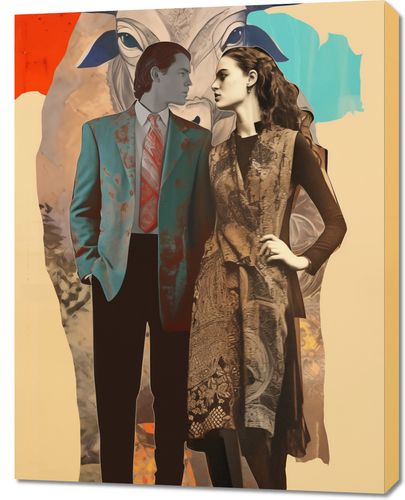 Obraz z serii abstrakcja zatytułowany Dialog Kultur. Ten unikalny obraz przedstawia mężczyznę i kobietę w tradycyjnych strojach, stojących na tle abstrakcyjnego wizerunku byka, który może symbolizować siłę i dziedzictwo kulturalne. Ich ubiory, pełne tekstur i wzorów, w połączeniu z modernistycznym tłem, odzwierciedlają zetknięcie się różnych epok i wartości. Obraz wyraża ideę harmonii pomimo różnorodności, łącząc w sobie elementy historyczne z nowoczesną abstrakcją. Jest to doskonały wybór dla przestrzeni celebrujących różnorodność i bogactwo kulturowe.