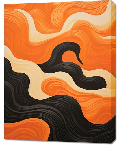Obraz z serii abstrakcja zatytułowany Dzień spotyka Noc. Falujące wzory przypominają o zachodach słońca na horyzoncie, gdzie słońce zanika za krętą linią nocy. Wzory w odcieniach pomarańczu i złota ścierają się z głęboką czernią, tworząc harmonijną grę świateł i cieni. Te przenikające się kolory dodają obrazowi energii i dynamiki, prowadząc nas przez krajobraz zmieniającego się dnia. Kontrast pomiędzy ciepłymi i chłodnymi tonami przyciąga wzrok i wciąga w głąb kompozycji. Idealny dla nowoczesnych kawiarni, artystycznych przestrzeni oraz domowych salonów pragnących wprowadzić nutę spokoju i refleksji.