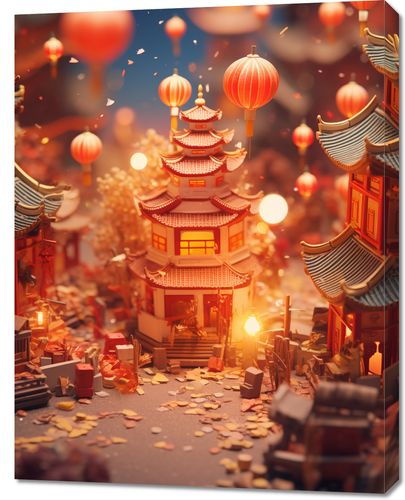 Obraz z serii motywy wschodnie zatytułowany Festiwale Świata. Ta urocza i ciepła kompozycja przedstawia tradycyjny azjatycki dom w sercu starożytnego miasta, rozświetlonego przez setki lampionów unoszących się w powietrzu, co nadaje scenie atmosferę świętowania i radości. Subtelne światło i złote konfetti na pierwszym planie tworzą efekt głębi i magicznego blasku. Obraz ten wprowadza do wnętrza ducha azjatyckiej kultury i jest doskonałym dodatkiem do przestrzeni, które chcą uczcić piękno i tradycję festiwali latarni, takich jak restauracje, salony spa lub jako wyjątkowy akcent w domowych salonach.