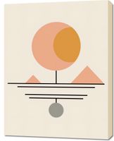Obraz z serii boho zatytułowany Geometryczna Utopia prezentuje stylizowaną scenę o charakterze abstrakcyjnym, gdzie geometryczne formy współgrają, tworząc spójną i uproszczoną kompozycję. W centrum znajduje się duże, okrągłe słońce w kolorze bladego pomarańcza, z mniejszym, pełnym kołem w odcieniu głębokiego złota, które symbolizujące światło. Pod słońcem ciągnie się poziomy, czarny trzon, z którego wychodzą trzy poziome linie, sugerujące horyzont. Poniżej środka kompozycji, zawieszone na czarnym trzonie, znajduje się szare koło, przypominające zawieszony obiekt lub planetę. W tle widoczne są dwie proste, różowe piramidy, które nadają głębi i perspektywy całości. Obraz oddaje minimalistyczne piękno i jest przykładem sztuki współczesnej, która wykorzystuje redukcję formy do wyrażenia estetyki i spokoju.