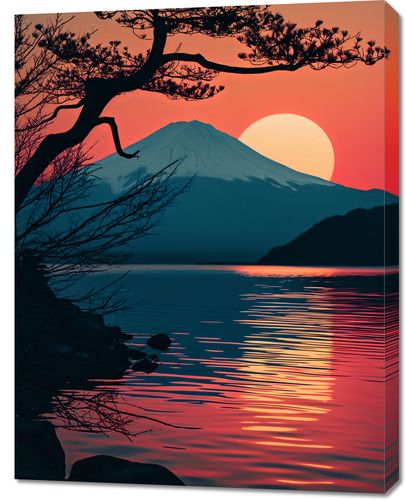Obraz z serii motywy wschodnie zatytułowany Góra Wieczorem. Urokliwe przedstawienie ikonicznej góry o zachodzie słońca, gdzie ciepłe odcienie czerwieni i pomarańczy rozlewają się po niebie i wodnej tafli, tworząc lustrzane odbicie. Sylwetka drzewa i góry na tle zachodzącego słońca wprowadzają atmosferę zen i wewnętrznej równowagi. Idealny dla miłośników estetyki wabi-sabi i minimalizmu, doskonale wpasuje się w nowoczesne wnętrza, a także wszędzie tam, gdzie pragnie się wprowadzić element uspokajającej natury.