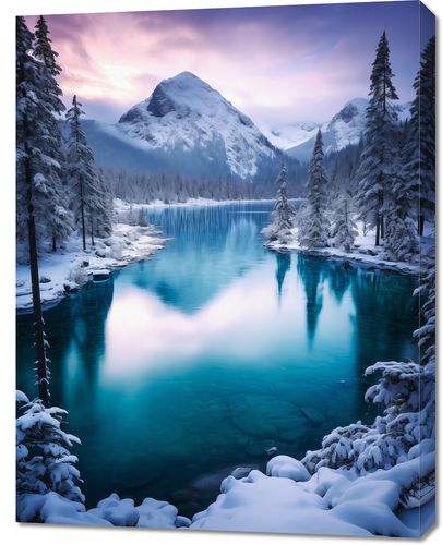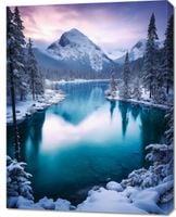 Obraz z serii pejzaże zatytułowany Górzyste Prześwity. Ten obraz ukazuje zachwycający zimowy krajobraz z krystalicznie czystym jeziorem, które odbija lśniące szczyty górskie i pastelowe barwy zachodzącego słońca. Obfite śnieżne pokrywy na drzewach i brzegach jeziora dodają scenie poczucia spokoju i izolacji. Idealny do wnętrz, które chcą wprowadzić elementy spokojnego piękna natury, ten plakat jest doskonałym dodatkiem do przestrzeni mieszkalnych, biurowych lub jako ukojenie w miejscach publicznych, wprowadzając atmosferę wyciszenia i odprężenia.