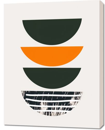 Obraz z serii boho zatytułowany Gra Tekstur to połączenie czystych, geometrycznych form z wyrazistą grą tekstur. Trzy półkoliste kształty w odcieniach głębokiej zieleni i żywej pomarańczy są ułożone w precyzyjny stos, tworząc zaskakującą głębię i zmysłową symetrię. Najniższa forma przerywa ten porządek, wprowadzając do dzieła dynamiczne, surowe detale, przypominające efekt artystycznego, spontanicznego malowania lub drapowania. Ten obraz jest idealnym wyborem dla wnętrz, które doceniają silne, graficzne elementy oraz surowy, industrialny klimat, pasując zarówno do minimalistycznych, jak i bardziej eklektycznych przestrzeni.