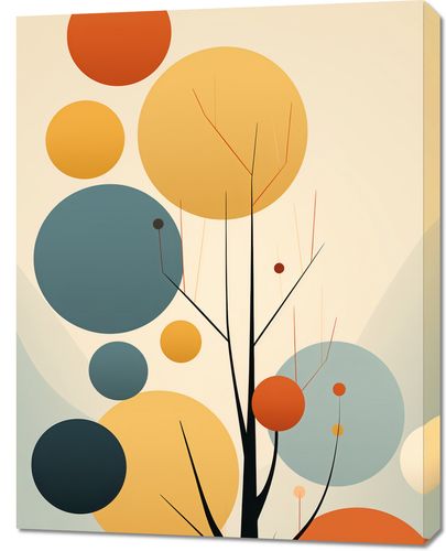 Obraz z serii wnętrza zatytułowany Harmonia Jesiennych Kolorów. Delikatne gałęzie drzewa, podkreślone przez cienie i linie, są otoczone przez okrągłe kształty w ciepłych, jesiennych odcieniach pomarańczy, żółci i niebieskiego. Kontrastujące kolory tworzą uczucie spokoju i równowagi, a jednocześnie dodają obrazowi głębi i dynamiki. Jego subtelny i elegancki design wzbogaca przestrzeń, dodając jej ciepła i przytulności. Idealnie pasuje do domowych salonów, kawiarni o spokojnym charakterze oraz przestrzeni relaksacyjnych, gdzie natura spotyka się z nowoczesnym designem.