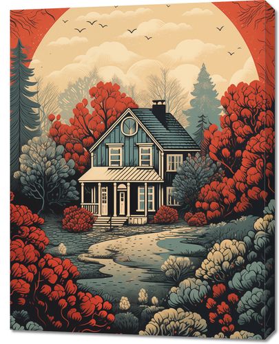 Obraz z serii wnętrza zatytułowany Idylla Rustykalna. Ten ciepły i urokliwy obraz przedstawia sielski dom otoczony przez bujny krajobraz w odcieniach czerwieni i pomarańczy, których intensywność podkreśla zachodzące słońce w tle. Kompozycja łączy w sobie elementy klasycznego amerykańskiego krajobrazu z nostalgicznym uczuciem, które przywodzi na myśl długie, leniwe popołudnia na wsi. Ilustracja ta idealnie nadaje się do nadania charakteru i ciepła każdemu wnętrzu, doskonale pasując do przestrzeni mieszkalnych, kawiarni lub pensjonatów, które chcą zaakcentować swoje powiązania z naturą i wiejskim spokojem.