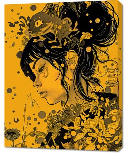 Obraz z serii motywy wschodnie zatytułowany Jedność prezentuje profil portretu młodej kobiety, którego kontury i przestrzeń wokół są wypełnione bogatym, złożonym motywem fauny i flory. Czarno-złota kolorystyka na tle w odcieniach musztardowego żółtego tworzy głęboki kontrast, który przyciąga wzrok i zmusza do refleksji. Włosy kobiety przechodzą w gęstą dżunglę roślin i zwierząt, symbolizując jedność z przyrodą. Wizualnie wyraziste i symbolicznie nasycone, dzieło artystyczne wydaje się idealne do wystroju nowoczesnych przestrzeni mieszkalnych lub miejsc publicznych, które chcą podkreślić związek z naturą i sztuką. Może być również doskonałym dodatkiem do galerii lub przestrzeni artystycznych, które cenią sobie oryginalność i głębię wizualną.