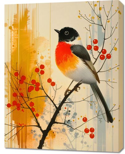 Obraz z serii abstrakcja zatytułowany Jesienny Rudzik przedstawia kolorowego ptaka, prawdopodobnie rudzika, siedzącego na gałęzi w otoczeniu jesiennych owoców i liści. Ptak jest szczegółowo narysowany z wyraźnymi kolorami, podkreślającymi jego piękno i elegancję, a jego poza jest pełna wdzięku i spokoju. Tło obrazu w ciepłych odcieniach żółci i oranżu, przypomina złotą paletę jesieni, z akcentami w postaci delikatnych kropelek i smug farby, które dodają dziełu głębi i tekstury. Całość kompozycji jest harmonijna i pełna spokoju, idealna do przestrzeni, które chcą wnieść element natury i spokojnego piękna do swojego wnętrza, takich jak salony, gabinety relaksacyjne, czy przestrzenie o tematyce przyrodniczej.