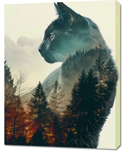 Obraz z serii natura zatytułowany Koci Duch Lasu. Ten obraz prezentuje zaskakującą kompozycję, w której sylwetka czarnego kota płynnie przechodzi w mglisty krajobraz leśny, łącząc świat zwierzęcia z dziką przyrodą. Złote i ciepłe odcienie jesiennego lasu w tle kontrastują z chłodnymi tonami gór, dodając głębi i tajemniczości. Mistyczne połączenie kota z naturą symbolizuje jedność i harmonię między żywymi istotami a otoczeniem, a także podkreśla dziką i niezależną naturę kota. Obraz idealnie nadaje się do przestrzeni mieszkalnych ceniących połączenie sztuki z naturą, takich jak nowoczesne salony, pokoje relaksacyjne lub gabinety, jak również może być inspirującym elementem dekoracyjnym dla gabinetów weterynaryjnych lub przychodni zoologicznych.
