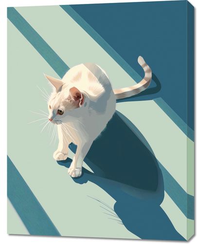 Obraz z serii wnętrza zatytułowany Kocia Persona przedstawia białego kota o intensywnie błękitnych oczach, który z gracją przemierza przestrzeń ożywioną grą cieni. Jego postawa jest skupiona i zwinna, a cień rzucony na pastelowoniebieskie tło tworzy silny wizualny kontrast, podkreślając dynamikę ruchu. Ostre linie na podłożu dodają głębi kompozycji, jednocześnie zachowując minimalistyczny charakter dzieła. Ten obraz będzie idealnym dodatkiem do nowoczesnych, jasnych wnętrz, które cenią sobie prostotę i elegancję, na przykład jako element dekoracyjny w salonie, sypialni lub przestrzeni biurowej, gdzie może dodać subtelności i lekkości.