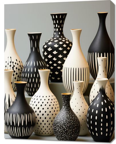 Obraz z serii wnętrza zatytułowany Kontrast i Harmonia. Eleganckie wazony w subtelnych odcieniach bieli i intensywnej czerni stoją dumnie na szarości tła. Geometryczne i abstrakcyjne wzory, które zdobią te wazony, przypominają tętniącą życiem tańczącą symfonię. Kropki, linie i formy tworzą intrygującą kompozycję, która przyciąga wzrok i dodaje wnętrzom wyjątkowej głębi. Subtelna gra świateł i cieni, a także kontrast między monochromatycznymi barwami, dodaje tej kolekcji odrobinę tajemniczości. Będzie to idealne dopełnienie zarówno dla nowoczesnych przestrzeni loftowych, jak i eleganckich salonów z naciskiem na design. Ten wyjątkowy plakat doskonale odnajdzie się w galeriach sztuki oraz w luksusowych hotelach.