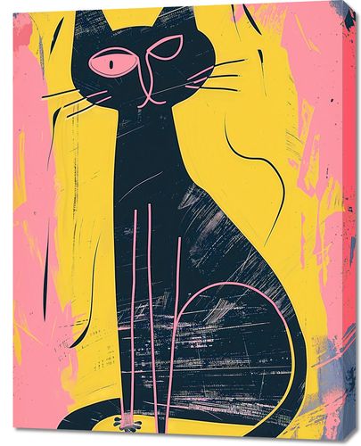 Obraz z serii abstrakcja zatytułowany Kontrastowa Kotka. Praca artystyczna przedstawia stylizowaną, abstrakcyjną sylwetkę czarnego kota na tle żywych, nieregularnych pociągnięć pędzla w odcieniach różu i żółci. Wzrok kota, zaznaczony jednym dużym różowym okiem, przyciąga uwagę i dodaje kompozycji charakteru. Mocne, geometryczne linie i intensywne kontrasty kolorystyczne tworzą nowoczesną i dynamiczną ilustrację, która przyciąga wzrok i staje się wyrazistym elementem dekoracyjnym. Obraz ten idealnie sprawdzi się w przestrzeniach miejskich, takich jak nowoczesne mieszkania, studia graficzne lub awangardowe kawiarnie, nadając wnętrzom śmiałości i wyjątkowego, artystycznego akcentu.