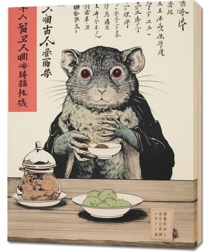 Obraz z serii motywy wschodnie zatytułowany Kulinarne Rozważania. Intrygujące spojrzenie wiewiórki, podkreślane przez wyraziste czerwone oczy i szczegółową sierść, skontrastowane z tradycyjnymi chińskimi znakami, dodającego atmosfery tajemniczości i refleksji. Na stole widzimy starannie podane potrawy, które w połączeniu z urokliwym zachowaniem postaci, tworzą obraz pełen kulturowego bogactwa. Doskonale sprawdzi się w azjatyckich restauracjach serwujących tradycyjne potrawy oraz w galeriach sztuki inspirowanej kulturą wschodu.