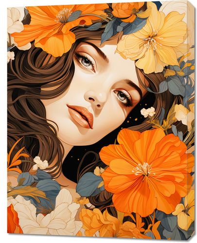 Obraz z serii natura zatytułowany Kwiatowa Esencja. Hipnotyzujące spojrzenie kobiety otoczonej eksplozją jaskrawych kwiatów podkreśla jej głęboką więź z przyrodą. Jej lśniące włosy splatają się z płatkami, a promieniejące oczu odzwierciedlają bogactwo i różnorodność przyrody. Płynące linie i bogate kolory sprawiają, że kompozycja jest niczym zjawiskowy ogród pełen życia i pasji. Wspaniale wpisuje się w wnętrza inspirowane motywami kiatowymi i kawiarniach