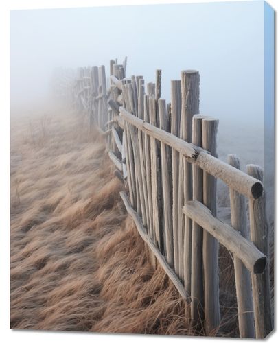 Obraz z serii pejzaże zatytułowany Mgła nad Wydmami. Prezentuje on eteryczny widok na drewniane ogrodzenie, które wiedzie przez poszarpane, suchą trawę wydm. Delikatna mgła otula scenę, nadając jej tajemniczość i spokój, a subtelne odcienie szarości i beżu tworzą uczucie miękkości i ciepła. Ten obraz idealnie oddaje atmosferę wyciszenia i rozmyślania, sprawiając, że jest doskonałym wyborem dla przestrzeni, które mają na celu uspokojenie i relaks, jak spa, pokoje medytacyjne, czy ciche kąciki w domach. To także piękny element dekoracyjny dla wnętrz inspirowanych naturą i spokojem przyrody.