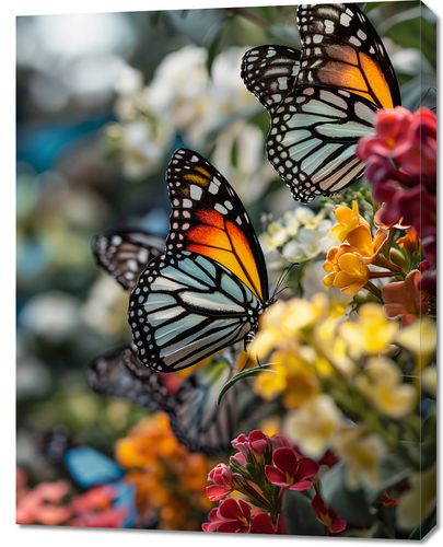 Obraz z serii natura zatytułowany Motyle Na Łące. Na obrazie widnieje trio monarchów, które z gracją spoczywają na kwitnących kwiatach, ich pomarańczowo-czarno-białe skrzydła wyłaniają się z tła pełnego barw i życia. Delikatne odcienie kwiatów w różnych odcieniach żółci, czerwieni i pomarańczy podkreślają naturalne piękno i delikatność motyli, a rozmyte tło nadaje kompozycji głębi i subtelności. Ten obraz jest celebracją życia i przemijania, idealnym do wnętrz, które pragną odzwierciedlić piękno i efemeryczność przyrody, jak salony, spa, czy pokoje wypoczynkowe.