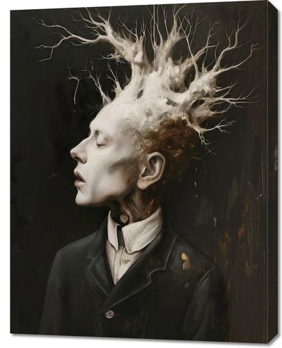 Obraz z serii abstrakcja zatytułowany Myśli Wzrastające prezentuje surrealistyczny portret mężczyzny, z którego głowy wyłania się skomplikowana struktura przypominająca korzenie lub gałęzie drzewa. Ten organiczny koronament wyrasta z myśli postaci, symbolizując rozwój, kreatywność i złożoność ludzkiego umysłu. Kontrast między żywą bielą i szarościami struktury a głębokim, ciemnym tłem sugeruje głębię i intensywność wewnętrznego świata postaci. Ten obraz może stanowić mocny wizualny akcent w przestrzeniach takich jak galerie, artystyczne pracownie, gabinety psychologiczne, a także we wnętrzach osób ceniących głębokie, filozoficzne refleksje.