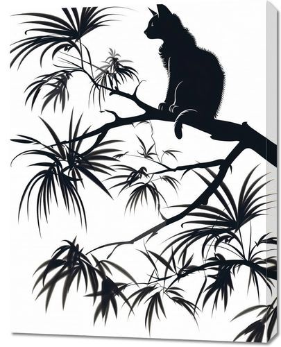 Obraz z serii wnętrza zatytułowany Na Gałęzi przedstawia sylwetkę kota siedzącego na gałęzi, zarysowaną na tle jasnego, jednolitego tła. Całość kompozycji utrzymana jest w stylu sumi-e, nawiązującym do tradycyjnej wschodniej techniki tuszem. Kontury kota i roślin są wyraziste, z delikatnymi szczegółami, które przywodzą na myśl efekt cieniowania i głębi. W tle roślinność, prawdopodobnie bambus lub tropikalne palmy, jest przedstawiona w sposób stonowany, co wskazuje na użycie gradientu cieni. Grafika ta oddaje spokój i harmonię, charakterystyczne dla azjatyckiej estetyki i sztuki. Idealnie nadawałaby się jako dekoracja w przestrzeniach inspirowanych minimalizmem i naturą.