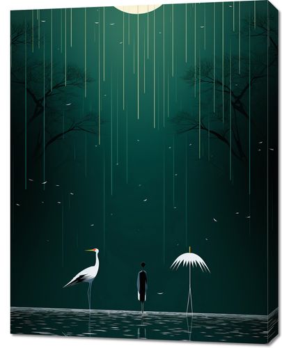 Obraz z serii wnętrza zatytułowany Nocne Marzenia. Scena przedstawia tajemniczą postać mężczyzny stojącego obok białej czapli, obaj są zanurzeni w wodzie i skierowani ku jasnoświecącemu księżycowi. Delikatne krople deszczu spadają z nieba, tworząc subtelną melodię natury, podczas gdy zarysy drzew rzucają cienie na monochromatyczne tło. Biały parasol unoszący się nad wodą dodaje elementu nieoczekiwanej magii i tajemniczości. Ta głęboka i metaforyczna kompozycja idealnie pasuje do nowoczesnych galerii sztuki, medytacyjnych przestrzeni oraz salonów czytania, gdzie cisza i kontemplacja dominują nad zgiełkiem codzienności.
