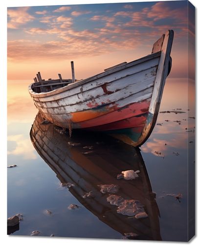Obraz z serii pejzaże zatytułowany Odosobniona Przystań. Artystyczne zdjęcie przedstawiające opuszczoną łódź o zesztywniałych żaglach, dryfującą na spokojnych wodach przy zachodzie słońca. Odbicie łodzi w wodzie tworzy niemal doskonałe lustro, w którym łączą się niebo i morze, a zanikające kolory podkreślają upływ czasu. Złote i pastelowe odcienie zachodzącego słońca w tle nadają scenie uczucie nostalgii i spokoju. Obraz ten doskonale nadaje się do wnętrz o morskiej tematyce, takich jak nadmorskie chaty, a także jako akcent dekoracyjny w przestrzeniach, które pragną odzwierciedlić miłość do morza i żeglarstwa.